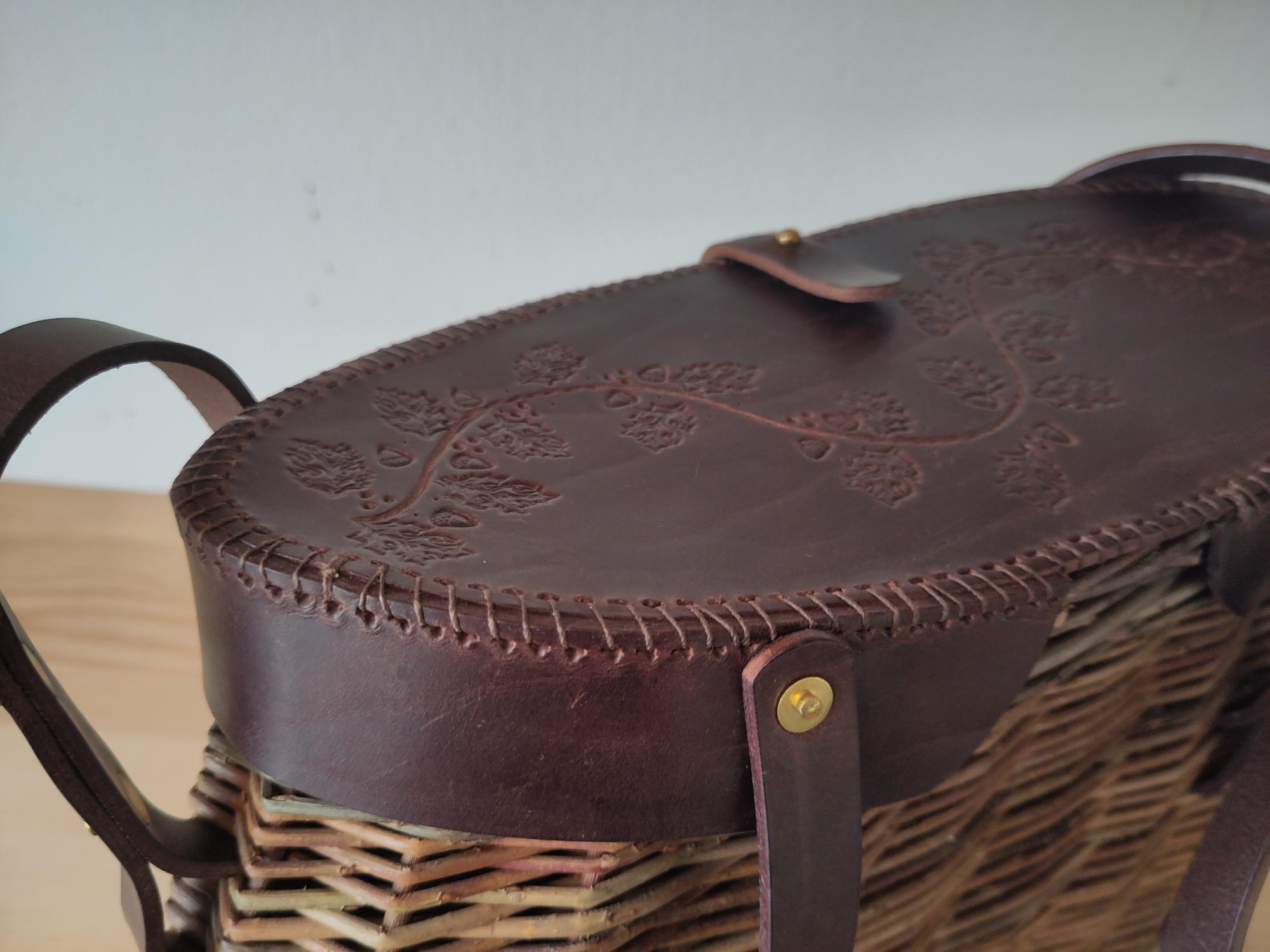 On the second day Justin Capp will teach the leather craft element of the course. You can compliment your basket with leather additions. Make a brass buckle adjustable strap with keeper and a lid of your choice. Choose between either the 'Harvester' (hinged flat lid, whip stitched to a fitted rim) or 'Gatherer'(hinged double thickness flat lid). Both options include the choice to decorate with traditional stamping tools to create a design of your own. You can also add a Sam Brown stud closure and straps and hinges fitted with copper rivets.