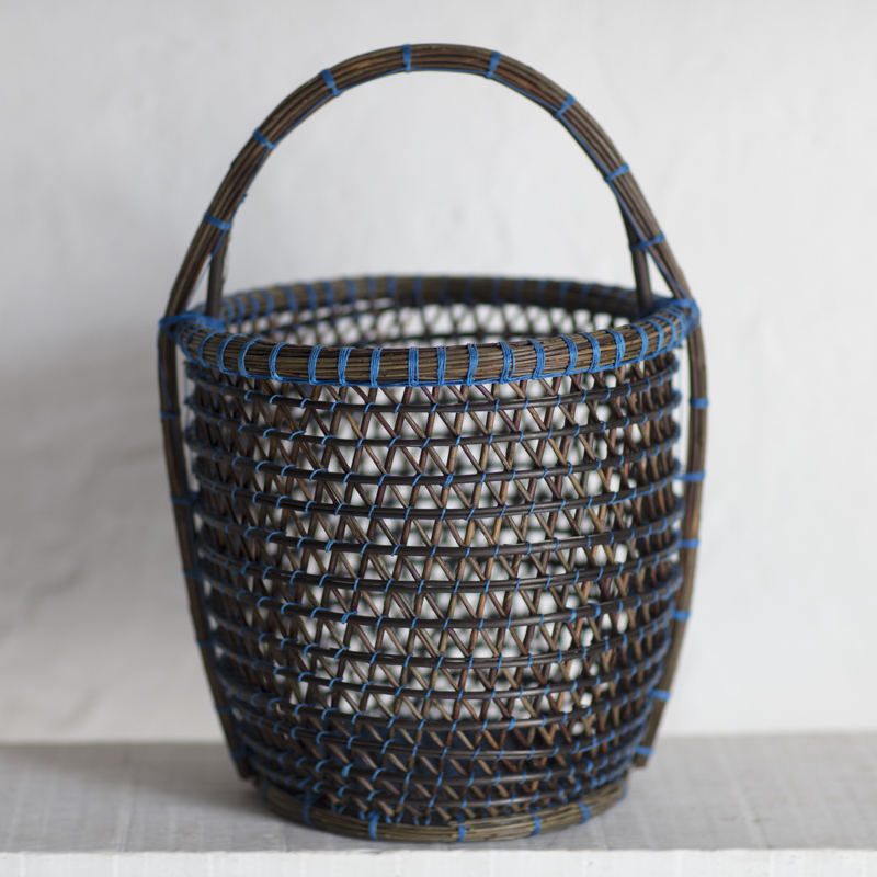 Monica has adapted this technique creating beautiful combinations of willow with different coloured threads. In this workshop you will start with a traditional nansa ‘grid’ base attached to a thicker willow hoop, then move on to the sidings, bundle border and handle to make a useful and elegant round basket.